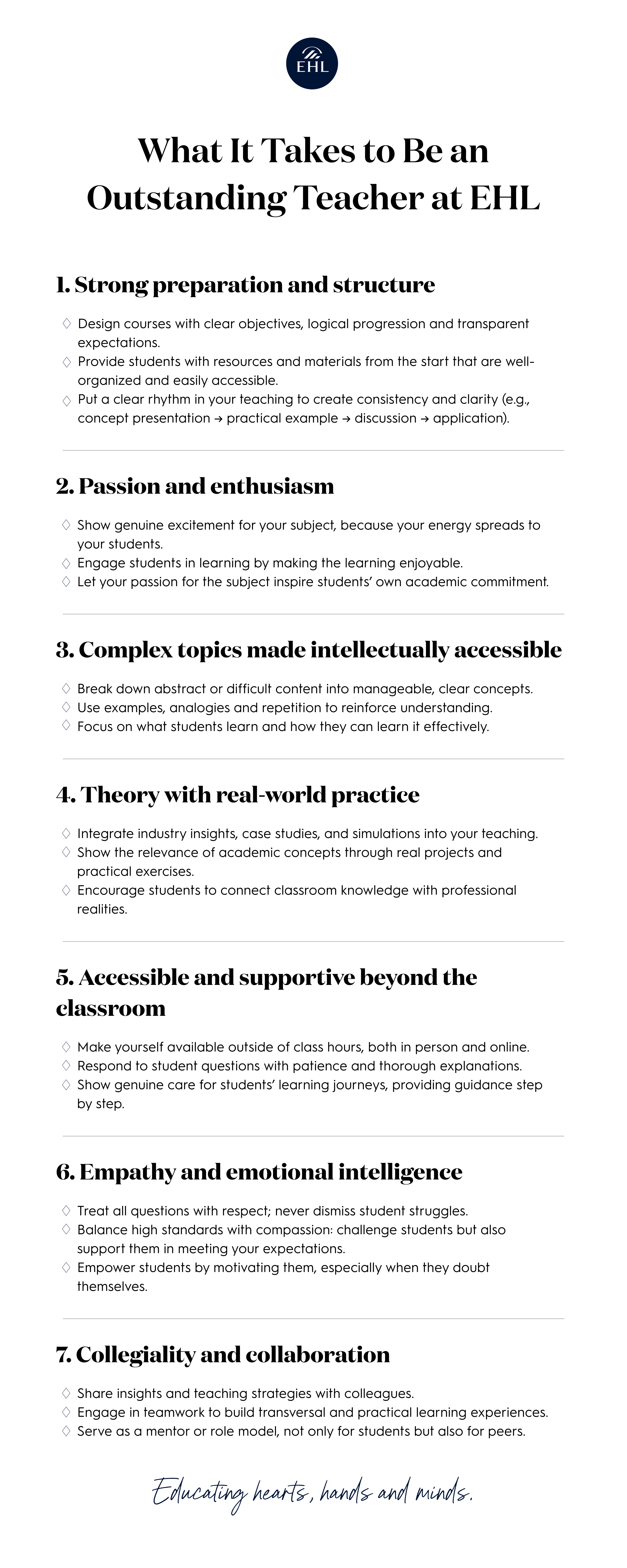 The following pedagogical recommendations embody the EHL teaching spirit and aim to create memorable, transformative learning experiences for our students.